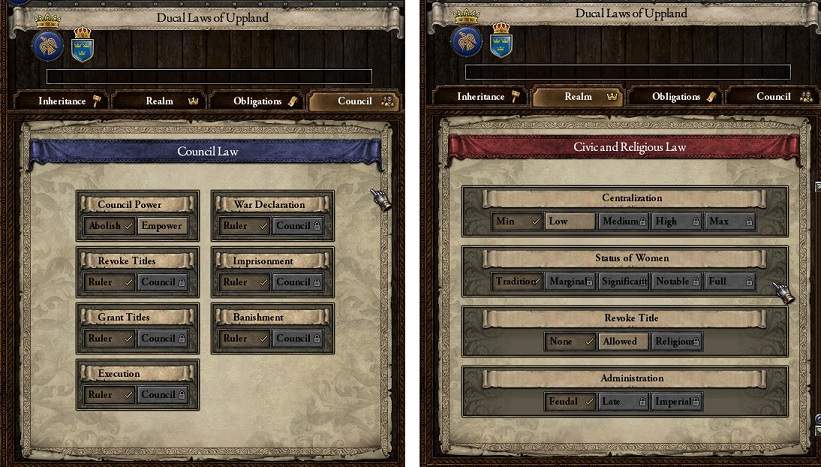 初期状態で評議会の権限が完全に無くなっており、直轄領にプラス2されているのが非常に大きい。 これはこのまま意地でも維持しつつ、称号剥奪法を、異教徒なら他に影響なくで剥奪可能にできるようにしていきたい。