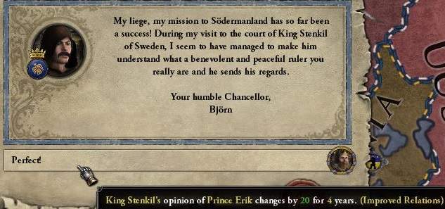 まあ、異教の家臣が配下の封臣食べ始めたら、そりゃあプレイヤーでも間違いなく同じことをするだろう。当然だ。 よってスウェーデン国内での勢力扶植は諦め、対外拡張を狙っていく。となれば宰相はヒマになるので、王との関係改善を行う、というわけだ。