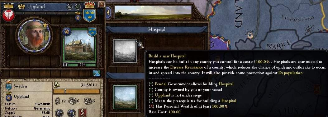 病院が無いプロビにはこうして警告が出るようだ。 病院は、トレードポストを建てる時と同じ要領で、右のタブを開いた先で建てることが出来る。 諸侯プレイでは滅多に開けることのないタブだが、これで存在価値が産まれたかな。