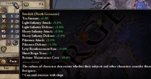 全ての文化が、それぞれ固有の様々なボーナスを持つようになる。 スウェーデン文化なら、上のSSの通り、歩兵・パイク兵系の全体的強化が主となっている。 他、近隣文化の一部を挙げると、下のようになっている。