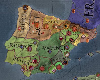 【地域について】 ゲーム開始時の領地であるアストゥリアス・デ・サンティリャナは現在のカンタブリア州に相当しているようです。 ゲーム上の首都(County Capital)はサンティリャーナ・デル・マル (Santillana del Mar)。 有名なアルタミラ洞窟が地元に在るようです。 ゲーム上のCityはサンタンデール (Santander)、修道院(Bishopic)はラレード (Laredo)です。