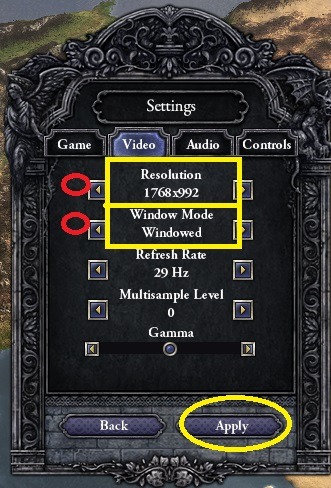 window Mode を windowedにし、resolutionを自分の全画面の設定が1920*1080なら1ランク以上下げ(1768*992とか)にしapplyをクリック,その後4番のQuitで一度終了させます。ふたたび起動するとウインドウ化