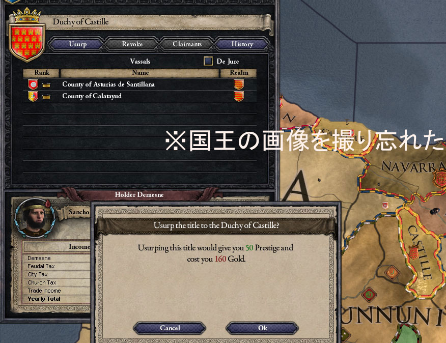 カスティリャ国王も名乗れるんやな。名乗っとこ。奪った相手は今度も外交で属国や。