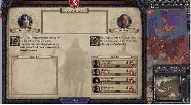 西暦805年6月12日ケント公爵ジョージ1世賢公崩御。彼は1代で弱小だったサセックス家をケント公爵にまで育て上げた。その最期はとても安らかだったと伝わる。