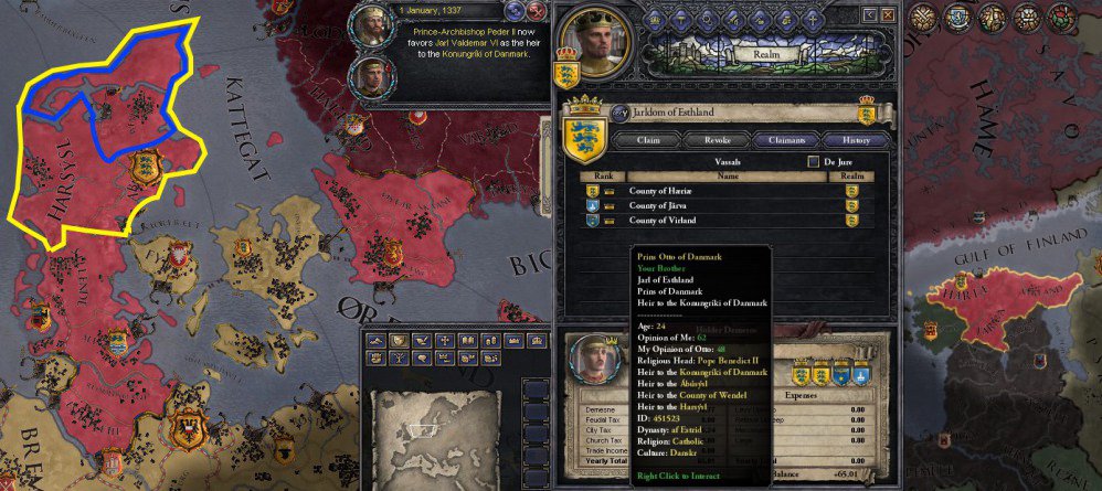 1337年のデンマークは混迷の底にいた。先王クリストファ二世の子のうち、 第一子イーレクはホルスティーンの反乱鎮圧の際の傷で1331年11月30日に父に先立ち薨去し、1332年にはクリストファ二世も崩御、デンマーク王位は空位となった。 第二子オトはエストラント公の地位にいたが1334年ヴィボーにて王位継承を求め挙兵した際ホルスティーン公ギアト(禿伯爵ギアトとも称される)に捕えられ、以後セゲベー城に幽閉されており、 残る王位請求者は第三子ヴァルデマのみであった。だが、ヴァルデマの領有する土地などはなく、 1339年にスリースヴィ公の妹ヘルヴィーと婚姻した際にやっとユラン半島のごく一部のみを手に入れ、王位に就いたのは1340年になるのだが 37年開始時3.jpg
