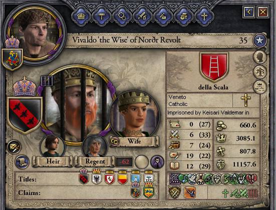 ノルドの皇帝ヴァルデマは、徒に国政を行い、その信心が少なく、あまつさえ諌言せんとしたテッサロニキ専制侯を弑した。