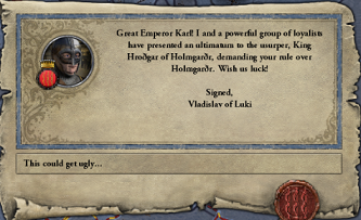 今度はホルムガルド内で、ルキ氏族のフラディスラフを中心に、スラヴ化に反発するノルド族長達が派閥化し、カルル帝がリューリク王の曾孫である事を根拠に、スカンジナヴィアによる東方支配を求めて反乱を起こしていたのである。 リューリク家はカルル帝と同様にヨムス・ヴァイキングの侵略に援軍を出していたが、これはノルド族長達に対するアピールも目的にしてのものだったと思われる。しかし、ノルド族長達の反発心はそんな事で抑えられる状態ではなくなっており、その援軍で兵力を減じた隙を見計らって決起した様であった。 この後、ホルムガルド内のフローニ氏族達も次々に決起しており、ホルムガルドの混沌は長期化の一途を辿っていた。