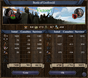 彼らが集結したグライフスヴァルトに、丁度ヨムス・ヴァイキングを雇って編成に加えたばかりの東カレーレン族長の軍が通り掛ったのである。 この軍団はスカンジナヴィア帝の徴集兵ではなく、帝国軍本隊に気を向けていたカソリック暴徒達は完全な不意打ちを受ける形となった……と記録されているが、なぜ遠くフィンランドの東に位置する東カレーレンが、ブランデンブルクに兵を進めていたのかは良く解っていない*2。 ともかく、この戦いでカソリックの暴動は大きく勢いを失い、スカンジナヴィア軍本隊は来るフリギアの叛徒達に戦力を集中する態勢が整った。