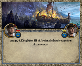 フレイ崩御の直前に、シグルド2世の死で即位したばかりのビョルン3世が不審死し、インガの婚約者・ハルステンが若干12歳でスウェーデン王位を継承している。 ワインに毒を盛られたと言われているが、彼の王としての才覚に疑問を持つものは余りに多く、容疑者は特定されていない。