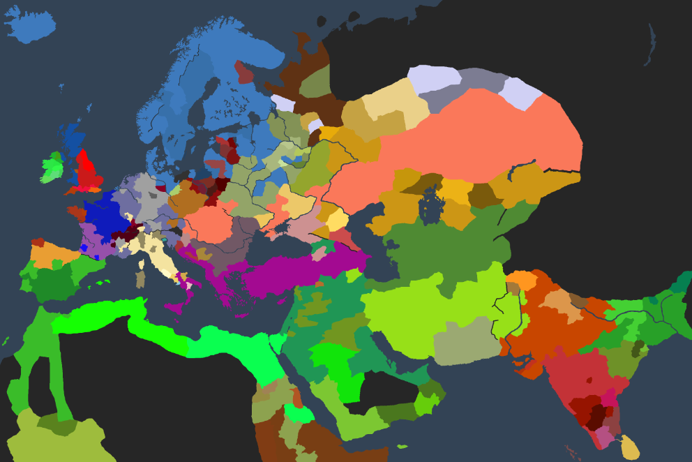 スカンジナヴィア帝国の版図には変化が無いので、欧州全体の勢力図を貼っておく。 本土からは飛び地となっているので解り難いが、東方に広大な版図を広げるのはテングリ国家・アールパード朝のハンガリー王国である。