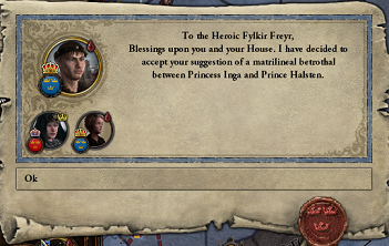 フレイはビョルン3世に、改めて盟主座への拝跪を行わせた。 そしてスカンジナヴィアとスウェーデンの和平と友好の証に、帝位継承予定者であるインガと、ビョルン3世の長男・ハルステンの、女系結婚の約束が交わされたのである*3。