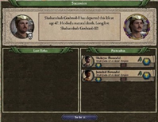 息子の死からしばらくして、Goshtasbは息を引き取った。 病死と公表されているが、最愛の子の死が余程堪えたのであろう、精神的なショックが原因によるものであった。 ペルシア奪還の狼煙をあげた偉大なる皇帝の最期は、とても可哀想なものであった。 享年47。後は次男Goshtasbが継いだ。