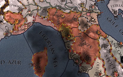 帝国内での私戦が禁止されたものの、王権を弱体化させるべく帝国と一戦を交えるほどの戦力は整っていないため、ひとまずは帝国外への拡張を行っていく事にしました。帝国外の勢力との交戦は①帝国の諸侯は(王権がMedium以下の場合)開戦事由に則って事由に宣戦が可能、②帝国外の諸侯はいかなる場合でも帝国内の諸侯には宣戦できない(戦争をする場合は帝国自体と戦火を交える必要がある)という極めて不公平なものなので、中小国相手には一方的に攻め込む事ができます。 なお、アンコナやボローニャは将来の併合も見込んで近親を送り込みましたが、無思慮に時間を進めると、逆にRudgerやGautierに与えた封土を奪われることにも繋がり兼ねないことに後から気がつきました。なお、BonaとRuprechtは運よく恋愛関係となり、なおかつ互いにKindのtraitを持つことで常に相互のOpinionが100を維持するような状況で、次々と子宝に恵まれました。まぁ、MatildaとFelipeはOpinionが常にマイナスだった割には子供が5人も生まれたので、一概には言えませんが。