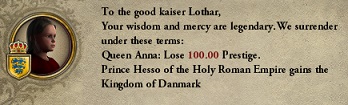 poppo2.jpg 皇帝。ポーランドの獲得、おめでとうございます。 lothar4.jpg ありがとう。だが、まだ何も解決してはおらん。 poppo2.jpg 何も……、ですか? lothar4.jpg そうだ。わが息子Adamは未だポメラニアの牢獄に繋がれたままじゃ。不憫でならぬ。   adam.jpg   poppo2.jpg その通りです。早急にポメラニアへの攻撃を準備せねば……。 lothar4.jpg 駄目だ。左様なことをしてAdamが殺されたらどうするのだ? poppo2.jpg それは……。 lothar4.jpg それに仮に首尾よくいったとして、Adamがフュン島に戻るのでは幽閉されたままも同然のことです。 poppo2.jpg ……でしたら、デンマークを攻撃してはいかがでしょうか? lothar4.jpg デンマークを?どういうことだ? poppo2.jpg Adam様の主君はデンマーク王でしたね。 lothar4.jpg そういうことになっているな。不本意ながらね。 poppo2.jpg ですから、デンマーク王を打倒して、帝国の版図に加えてしまいましょう。 lothar4.jpg それでどうなるというのだ? poppo2.jpg ポメラニアもまさか帝国に歯向かいたくはないでしょう。 lothar4.jpg 開放がならなければポメラニアも攻めればよい訳か。 poppo2.jpg まぁ、そういうことです。 lothar4.jpg 全軍に告げよ。我々はデンマークを攻略するとな。あの土地は我が子Hessoが領すことになろう。   result.jpg   すでにポメラニアとの戦争に疲弊していたデンマークは殆ど抵抗を示すこともなく、神聖ローマ帝国軍によるデンマークの占領はただ静かに進んでいった。戦争の結果、皇帝Lotharの三男、Hessoがデンマーク王に即位した。 デンマークの降伏から時を経ず、次男Adamは牢獄から救出され、ブランデンブルク*2を与えられた。