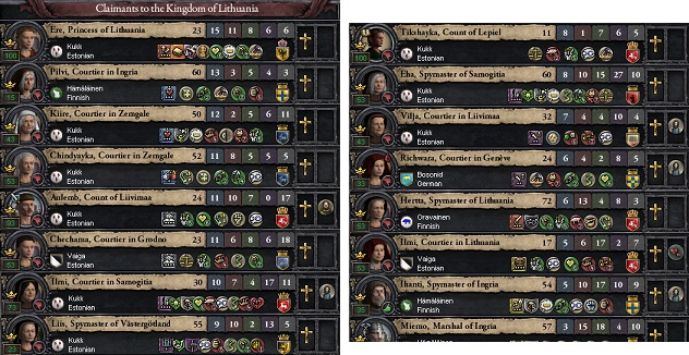 バスク文化やカタル派固有の相続法であるAbsolute Cognaticによる男女均等の相続システムを採用している場合を除いて、すでに別の封土を保有しているのでなければ、臣下の女性に新たな(土地つきの)爵位を授けることはできません。このため、土地なしの女性キャラの請求権を主張して他国を侵略することは、同族でもない限り困難です。しかし、この場合、女性を即位させることそのものに意義があります。女性が即位することによって、男性キャラの持つ弱い請求権を行使することができるようになるからです*4。これを利用して「強い請求権を持つ女性キャラ」「弱い請求権を持つ男性キャラ」の2名の請求者を確保することができれば、征服を敢行することができるのです。 なお、一度戦争をした国家と、和平締結直後に再度戦争をするということになるのですが、CK2では停戦や和平などは国同士の条約ではなく、当主同士の個人的な契約とみなされるため、和平による停戦期間が設定されるのはあくまでも元の当主だけで、あらたに即位させた人物との停戦は成立していません。このため、この方法を用いても停戦破棄ペナルティの対象とはなりません。