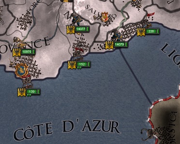 モンゴル軍は移動速度が速く、攻撃力も高い、そのうえ冬の荒地でも消耗しないというチートに近い特性を持っており、さらに合計10万に近い大軍を動員してくるため、正面からの野戦でこれを打ち砕くのは極めて困難です。特に、ハンガリーのようなインフラの低い内陸ともなればなおさらのことでしょう。しかし、戦争の規模が増大するにつれ、野戦の価値が相対的に低くなることもまた事実だと思います。 野戦によって得られるポイントは勢力全体で動員可能な兵力に応じて変動し、同じ規模の軍勢を倒した場合でも、巨大兵力を誇る敵が相手の場合、得られる勝利ポイントは小さくなってしまいます。一方、占領による勝利ポイントは比較的に変動が少ないため、相対的に価値が上がる訳です。さらに言えば、国の総動員兵力が大きくなっても、各城を守る守備兵の数は変わらないため、強襲攻撃(assault)が成功しやすく、攻囲戦によって膨大な時間がかかるという欠点も補われるのです。 今回の黄金のオルドとの戦争では、ハンガリーでの激突を避けつつ、背後に回り込み、クリミア半島やバルト海周辺の占領を試みました。これには複数の意味があります。まず重要なのは主力軍同士の野戦の回避できることですが、それに加え、ハンガリーよりも背後の地域の方が城砦レベルが低いプロビンスが多く、10000人程度の軍勢で強襲攻撃を掛けられる場面が増えるからです。さらに、モンゴル軍の本体をハンガリーから遠く離れさせることで、ハンガリー領内のプロビンスを占領する隙を作ることができます(ハンガリーの全プロビンスを保持された状態だと時間とともにモンゴル側に勝利ポイントが加算されてしまいます)。
