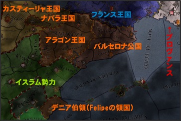 ちなみにFelipeは前王Sanchoの三男ですが、次男はすでに死去しています。とはいえ、長男のアラゴン国王にはすでに1男2女がいるため、Felipeの王位継承順位は4位でした。アラゴン王国の相続はあまり現実的ではありませんでしたが、注意しないといけない点があります。生まれた息子がプロヴァンス(神聖ローマ帝国内)に領地を持たない状態でアラゴン国王になってしまうと、プロヴァンスを相続した時点でプロヴァンスが神聖ローマ帝国から抜けてしまうという点です。これを避けるためにはアラゴン王位が転がり込んでくる以前に相続人(息子)に領地を与えておく必要があります。