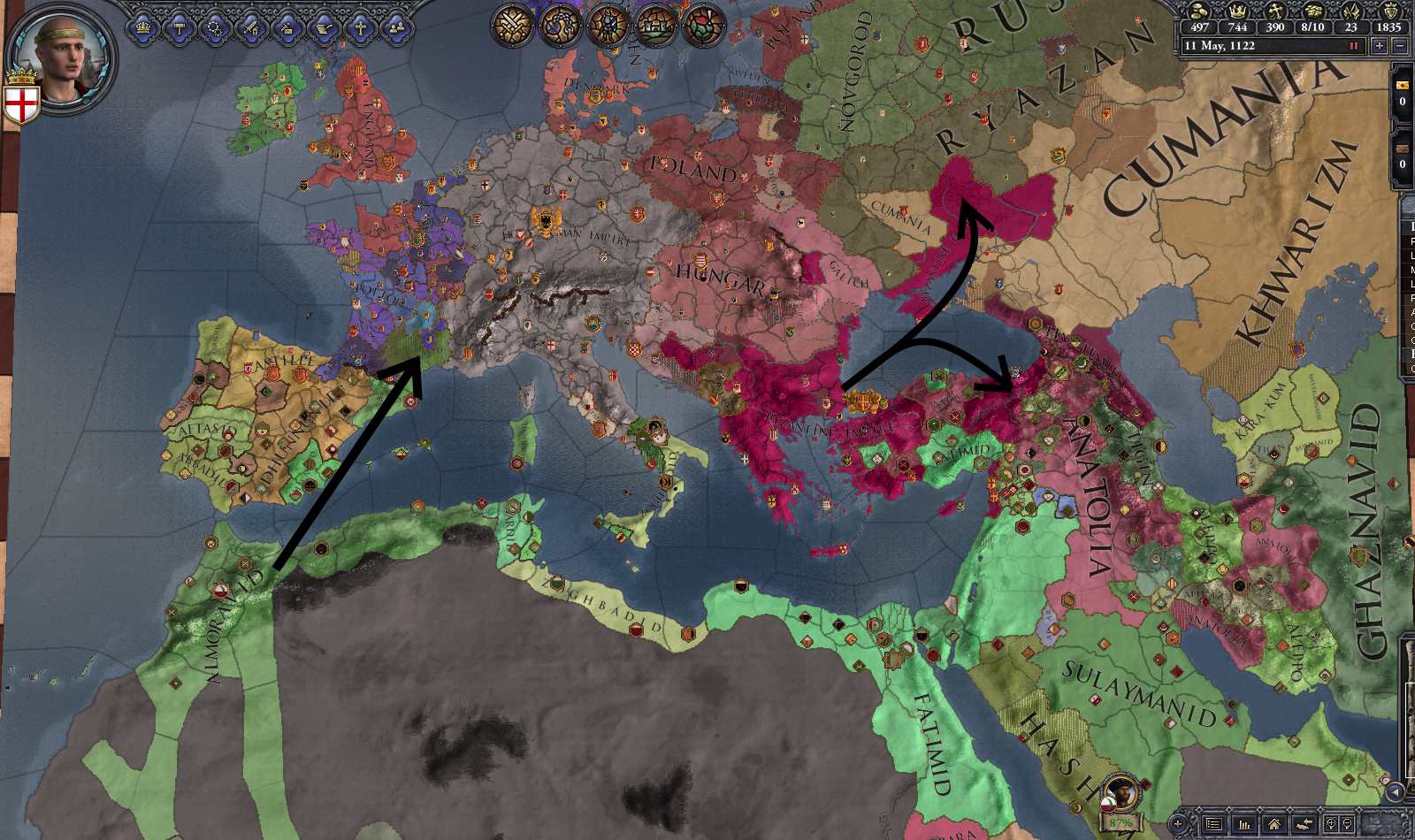 画像は若干時代が下る1122年のものである。 フランスでは新王の幼君が即位するが継承危機は収まらず、これに乗じてモロッコ王国が南仏を併合し手がつけられなくなっている。 同様にスペインのキリスト教勢力も滅亡は時間の問題に見える。 東ではセルジューク朝が崩壊。おかげで東ローマはいくらか領土を取り戻している。