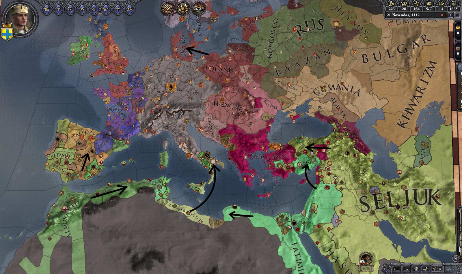 地中海ではモロッコ・エジプトが拡大、東ローマ帝国はエジプトとペルシャに侵攻され風前の灯。 南イタリア、スペインでイスラム化が進行。 また十字軍が成功し、一度はエルサレム王国が成立したものの、その後すぐに行われたジハードによって消滅している。 北ではポーランドがデンマークを婚姻により継承。 フランスでは王位継承戦争が勃発し大混乱に陥っている。