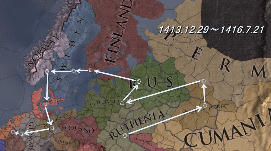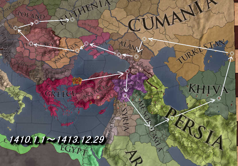 1410.1.1 コンスタンティノープル出立    6.30 トラペザスーアナトリア    11.1 エデッサーアルメニア 1411.2.7 バグダッドーメソポタミア   .5.26 レイーペルシャ 1412.1.10 ヌクスーヒヴァ    3.29 キジルオルダートルケスタン    9.6  サライークマン    10.13 アラニアーアラニア    11.20 アブハジアーグルジア 1413.2.5 オルシェーブータウリカ   .3.1 ベルゴロドーワラキア   .6.23 エステルゴムーダキア   .8.21 プラハーボヘミア   .10.16 クラクフーポーランド   .12.29 キエフールテニア