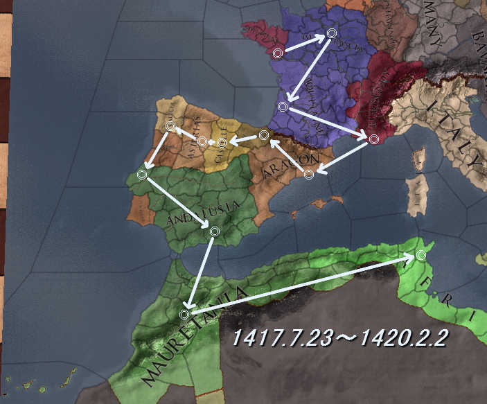 1417.9.6 パリー西フランク(フランス)   .11.8 ボルドーーアキテーヌ 1418.1.23 プロヴァンスーブルグンド   .5.27 バルセロナーアラゴン   .7.9 ナヴァラーナヴァラ   .8.20 ブルゴスーカスティリャ   .9.7 レオンーレオン   .10.27 サンティアゴーガリシア   .12.3 リスボンーポルトガル 1419.2.5 グラナダーアンダルシア   .5.15 マラケシューモーリタニア 1420.2.2 チュニスーアフリカ