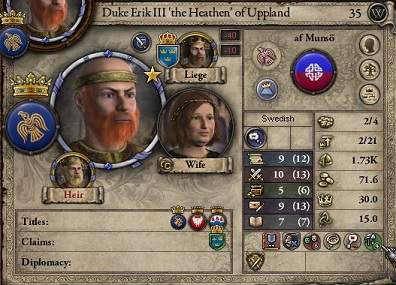 ウプランド公家には異色の家臣が2人いる。 1人は宰相。「天才」持ちのカトリックスウェーデン人。何度リロードしても「天才」が固定なので、恐らく何か史実でエピソードがある人なのだろう。 1人は元帥。何とシーア派を信仰している。こちらも、何度リロードしても武勇20で固定なので、恐らく史実の人物なのだろう。