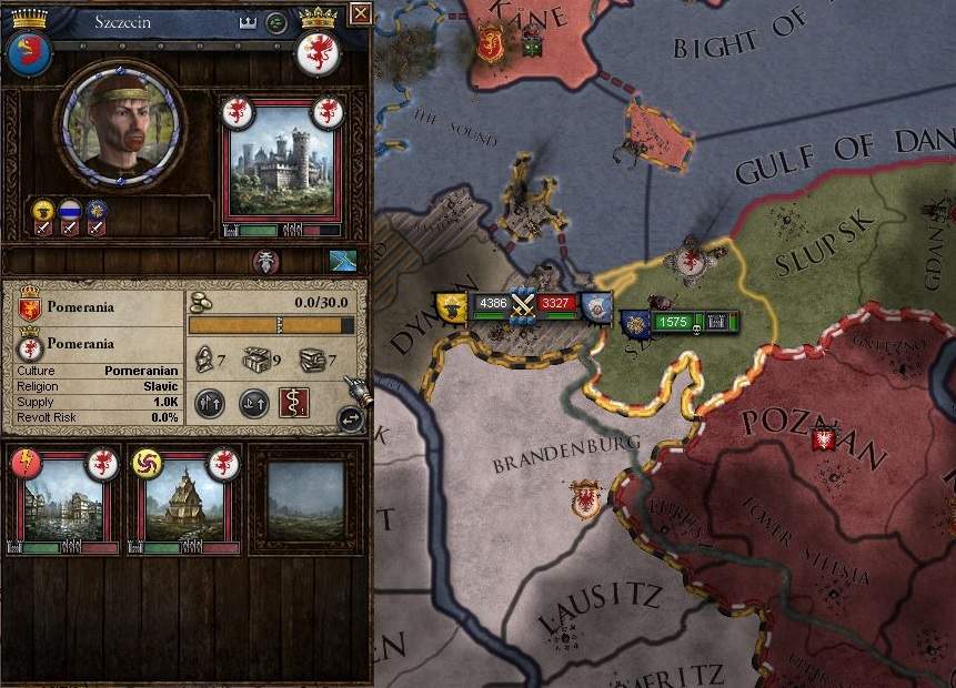 バルト南岸、スラブ教徒のポメラニア公国に宣戦する。 コンクエストCBを海の向こうにも使えるというバイキングの特性は、一神教が相手の場合だけで、 多神教が相手の場合は、海越えでは服属CBか属国化CBしか使えない。 服属CBでポメラニア公号を奪い、後にシチェチン伯を剥奪、とするのも考えたのだが、 分割相続である以上複数の公号を持ちたくないことから、請求権捏造でのピンポイント攻撃とした。