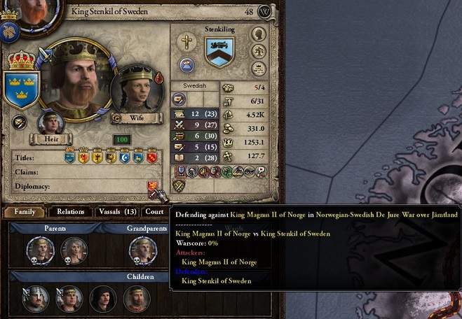 ノルウェー王が、ノルウェー王dejureに当たるヤムトランド領の割譲を求めて宣戦、スウェーデン王が王国総動員をかけていた。 ヤムトランドといえば、ウチの臣が収めている部族領である。そこを守っていただけるとは、いやいや、ありがとうございます陛下。