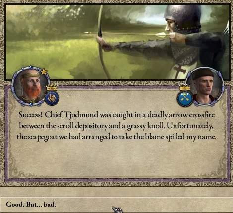 前回同様、開幕でヤムトランド族長にコンクエスト。 ヤムトランドを適当に攻めつつ、評議会派閥を形成していた臣下の伯の暗殺plotを立て、命と領地を共に頂く。