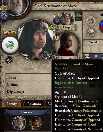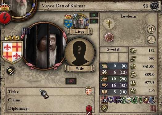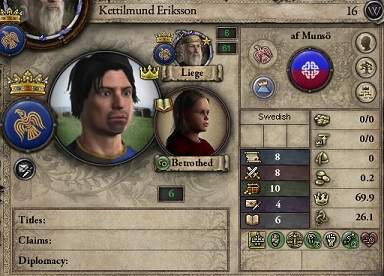 1094年2月、エリック公はストレスを得た。60歳を過ぎてストレスとはいよいよいつ死んでもおかしくない。息子2人への分割相続について考える。 要するに今絶対に保持しておきたい領土は「ウプランド」「シェラン」の北欧の大都市2ヶ所のみで、他は2スロット3スロットの貧乏州ばかり、手放しても惜しくない。 ウプランドは首都だから絶対に長男に引き継がれるので、要はシェランだけうまいこと王に渡せればいいのだ・・・
