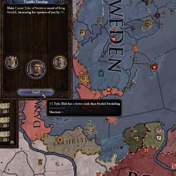 1066年だと、今回奪い取ったシチェチン以外は、初期状態で4000近い兵力を出せるスラブ教徒のOSOTIRITIA公が所有しているため、 スラブ異教の損耗ペナルティも相まって、ノルウェーやデンマークを攻めるよりも辛い。 そこで、弱体なポメラニア公が保有するシチェチン一点狙いではぎ取ったというわけだ。