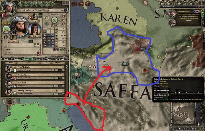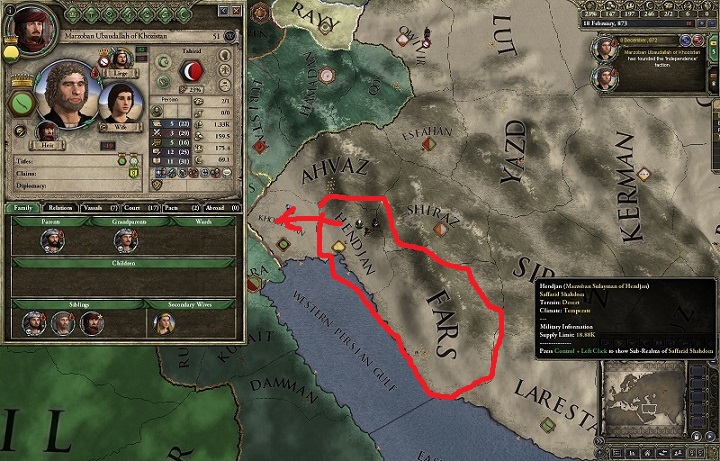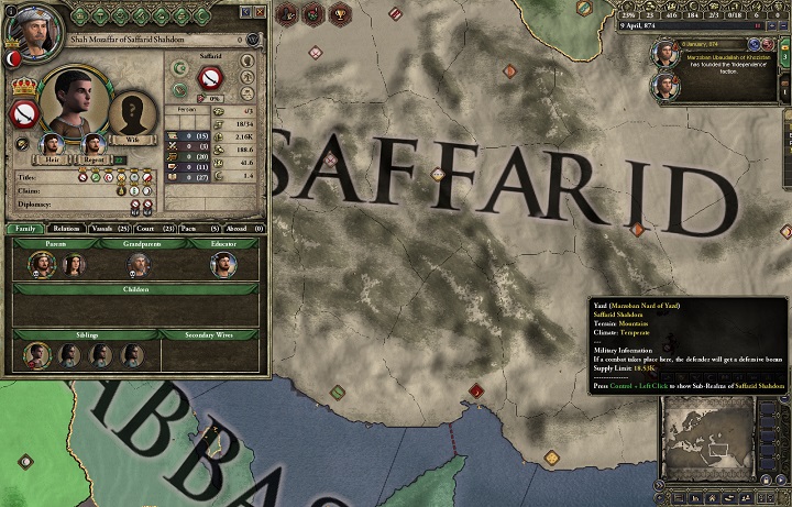 ターヒル家はホラーサーン地方(ペルシャ中央部)を治めていた王家である*1。 イスラム帝国に前に屈したペルシャ人であったが、歴史深いペルシャ人の民族意識は消えることなく、ついにアッバース朝からターヒル朝を頂いて独立した。 周辺のゾロアスター教地域に聖戦を仕掛けながら領土を拡大してペルシャ全域に影響を及ぼす勢いだったが、867年時点で臣下サーマーン朝の独立や、サッファール朝の猛攻によって王朝の命運は風前の灯火であった。