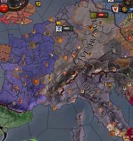 東フランクの西進によって中フランクとイタリアが両断されて、西フランクとアキテーヌに接触している。また、バイエルンが中フランクから分離している。兵力については、バイエルンが3000、アキテーヌが7000、東・中・西フランクはそれぞれ10000程で拮抗していたと考えられている。  これらフランク系の国家は何れもカロリング朝の版図であったが、中フランク(及びバイエルン)は、2代前の女王・アデーレがプラウエン伯・ロスティスラフと結婚した事で、モラヴィア王国に由来する東欧系の血筋であるモイミル朝となっていた。アデーレとロスティスラフの版図は、唯一の息子であったペルリム残酷王に継承されたが、ペルリムの死後、中フランクとイタリア王冠は長男・ズビネックに、バイエルン王冠は次男・ロスティスラフに分割継承されたのである。