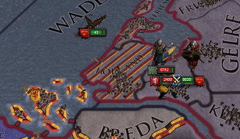 ともかく、先ずは艦隊から上陸した常備軍4000名、それに陸路で徴集兵6500名が合流し、968年の中頃にはゼーラントからホランド、西フリースランドの占領が完了した様である。そこで漸く中フランクの同盟国、ビザンツ・ボヘミア軍の合計約12000名が到着。ゼーラントへの進路を妨害するスカンジナヴィア軍と、ヴラーディンゲンで全面衝突となる。