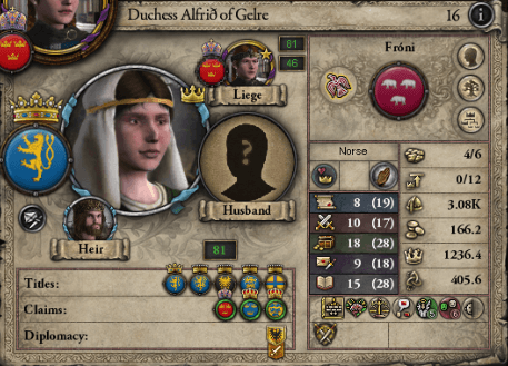 1020年9月、ギュリドの妹であるゲルレ大族長・アルフリドが成人。物静かな人物だが思う事には素直で、公正にして敬虔な人物に育っていたという。  ギュリドとの仲も良好で、帝位への請求権こそ持つものの、その天才を乱用して簒奪を窺う様な事はせず、ゲルレに善政を布いたという。