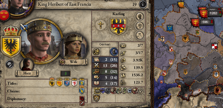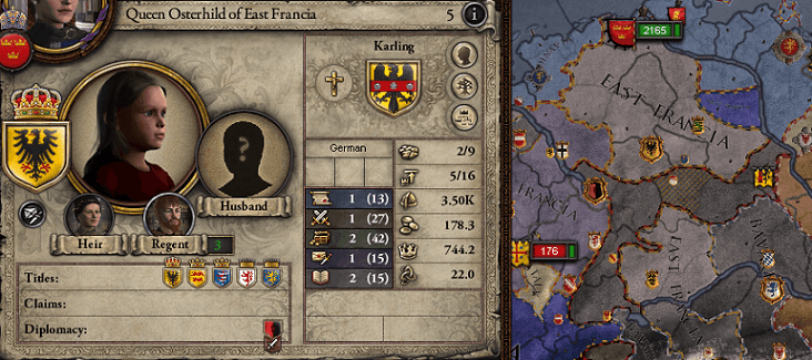 東フランク。"大女王"マリアは1006年に不審死し(恐らくは暗殺だが、首謀者は不明)、その息子のヘリベルトが王位に就いている。  彼の治世は長くは続かず、1022年に彼も母同様に不審死し、娘のオステルヒルトが僅か5歳で戴冠する事になる。