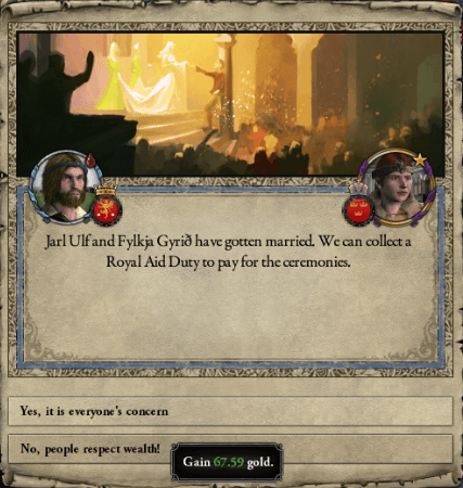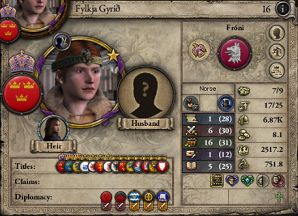宮廷の審査によって結婚相手に選ばれたのは、ほぼ同時期に成人した西ゴートランド大族長・ウルフである。ギュリドとは対照的に多弁な人物であった彼の、そのコミュニケーション能力の高さが求められての事である。  野心的なスウェーデン系フローニである彼はギュリドを一方的に嫌っていた様であるが、皇配という地位を目当てにこれを受ける。ギュリドは彼に対して何ら感想を持つ事もなく、まるで関心を見せないまま、黙々と族長達から受け取った貢物を、部隊の補給に宛てるよう指示した。この貢物が、内乱の明暗を分けた。