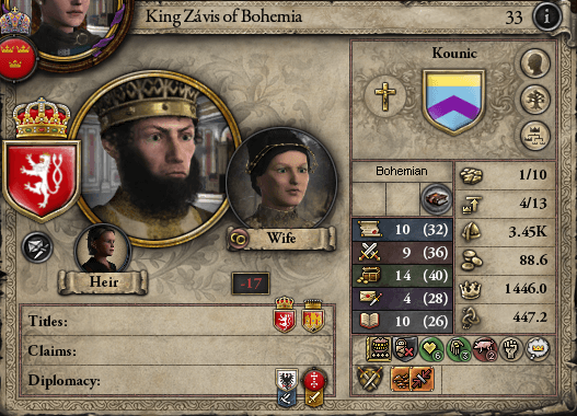 ボヘミア王夫妻。ザーヴィシュ王はモイミル朝ボヘミア王の血を引く庶子で、代が変わった際にその請求権で王位を簒奪した野心家である。