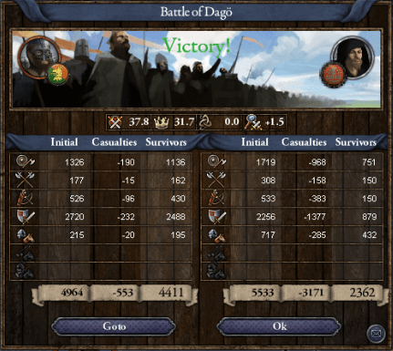 こうして行われたのが、「ダゴ島の戦い」である。予めリガ湾側に並べた虫船(スネッケ)の群れでダゴ島を目指す反乱軍の船団を包囲・迎撃し、乱れた隊列で上陸した者達を陸上で待機していた部隊が確固撃破する作戦は功を奏して、帝軍に圧倒的な勝利をもたらした*1。  以降、長期に渡る追撃戦でスカンジナヴィア帝国の国庫はまたも枯渇するが、この決戦によって、内乱の趨勢は完全にギュリド勝利に傾いたのである。