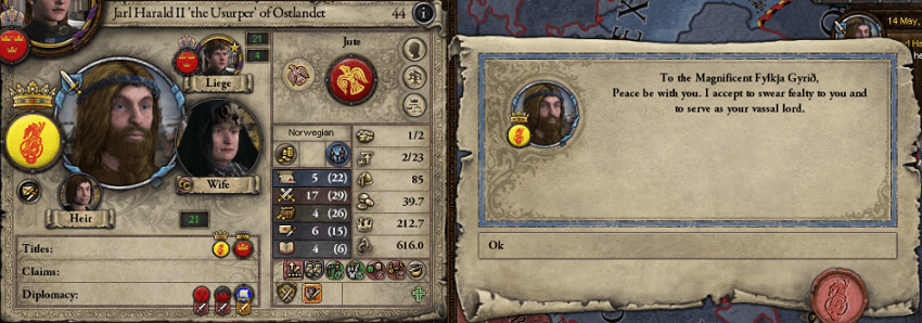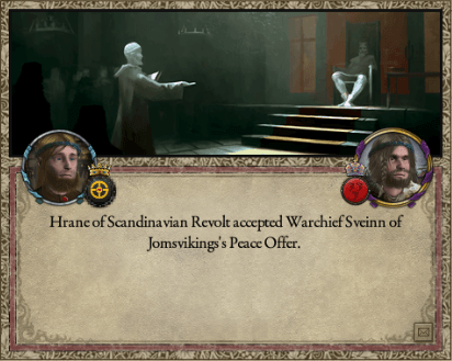 ハーラル2世はスカンジナヴィア帝国の使者に二つ返事で臣従する事を認め、ホラーネの叛乱軍は最早組織としての体裁を保つ事もできなくなっていた。