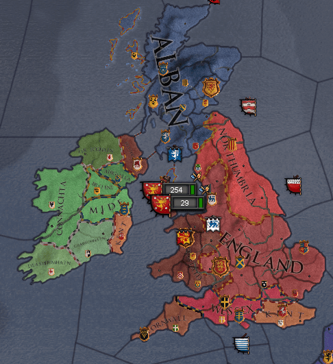 ブリテン島。マーシア朝イングランド、ウェセックス朝ウェセックス、ノーサンブリア朝ノーサンブリア、モルガン朝アルバ及びブリソニアが割拠し、拮抗状態にある。  国力ではモルガン朝同盟が一つ抜けて強いが、イングランド王とウェセックス王はどちらもアストゥリアス国王・ディエゴ3世を同盟者に持ち、睨み合いが続いていた。
