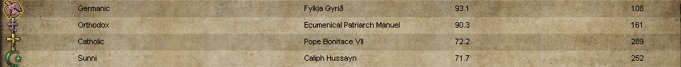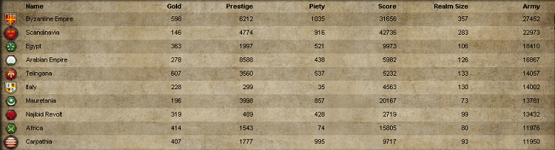 一位は文句無しのマケドニア朝ビザンツ帝国。何と言っても大ローマ(の東方領土)を直接継承する最大の正教国家である。  二位はフローニ朝スカンジナヴィア帝国。ユラン半島から始まったフローニの覇業が、1世紀半という短さでノルド世界をこの高みまで押し上げた。大躍進である。  三位はトゥールーン朝エジプト王国。シナイ半島からトリポリタニアまでを支配するイスラム世界最大の先進国で、その繁栄はカリフ国をも凌ぐ。  四位はナジブ朝アラビア帝国。スンニ派カリフ国。完全な状態であればビザンツと拮抗し得た筈なのだが、国内では絶えずアッバース朝との争いが続いている。  五位はラーシュトラクータ朝テランガナ王国。インド亜大陸の中央部を支配するジャイナ教の大国である。  六位はラヴェンナ朝イタリア王国。西欧世界で唯一のベスト10入りである。慣習領土と実効領土がほぼ完全に一致する数少ない国家でもある。  七位はウマイヤ朝モーリタニア王国。反乱によってヒスパニア領の大部分はクタミ朝のものとなっているが、流石の名門である。  八位はアラビア帝国内アッバース朝派勢力。朝内に蔓延った頽廃によってナジブ朝にカリフ位を奪われたが、その奪還を求めて絶え間ない反抗運動を続けている。  九位はアグラブ朝アフリカ王国。慣習領土の約半分をトゥールーン朝に飲み込まれていて尚この順位。この時代、イスラム国である事は先進国であるという事だった。  十位はアールパード朝カルパチア帝国。帝国を名乗ってはいるが、クマニア領を反乱で喪失し、その版図はハンガリー王国領のみである。