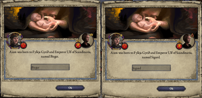 その11月頃にギュリドの妊娠が明らかになる。翌年6月に生まれたのは双子で、兄はビルゲル、弟はシグルドと名付けられた。