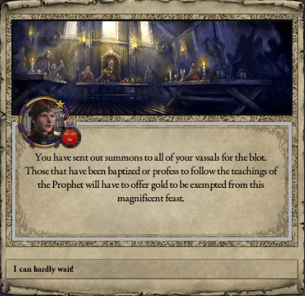 ギュリドは終戦を記念し、帝国の安泰を祈る為に、大犠牲祭(グレート・ブロット)の開催を宣言したのである。  この年の大犠牲祭の様子は一種異様な程克明に記録されている。先ず、この時にホーセンスの牢に囚われていた11名から4名を、「天意」によって選ぶ為に、一人ずつサイコロを振らせたという。
