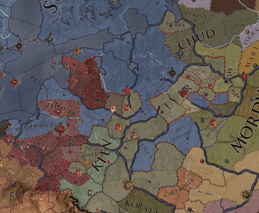 中欧~東欧。まだまだ部族集団の割拠状態が続いている上にスカンジナヴィア帝国の飛び地も多く、混沌としている。  これまでは比較的安定しているかに見えたリャコヴィッチ朝ルテニア王国だったが、前王の息子二人の間で深刻な継承争いが勃発して版図が分裂してしまっている。そしてアールパード朝出身のエレクなる人物の侵略を受け、キエフ公爵号は完全に国外に流出、慢性的な係争状態にある。