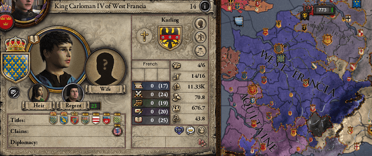 西フランクでは反乱が収まっていたが、1016年の中頃にギーグ2世が心労によって身罷った事でその長男・カルロマン4世が戴冠していた。  このカルロマン4世、愚鈍と呼ばれたギュリドを遥かに"下回る"愚鈍ぶりで、国内の安定は望むべくもない状態であったという。
