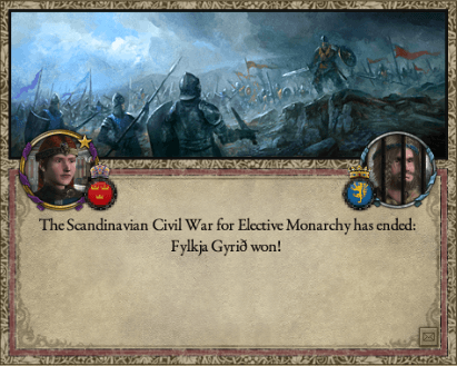 そして、この内乱で最も問題視された人物……ギュリドの叔父であるヘルギ王からは、ノルウェー王位が剥奪されている。これによって大幅に増えた直臣数は帝国民会のキャパシティを超えており、これを調整する為に新たにリトアニア王位が設けられ、リトアニア大族長・ハフリドに与えられた。