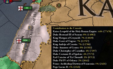 おそらくランダムのタイミングで教皇が十字軍の編成を呼びかける場合があります。十字軍の目標地には優先順位があり優先度が高い目標地点のうち異教徒や異端者に支配されている地域が選ばれます。十字軍への参加にはいくつかのメリットがありますが「参加することによる効果」と「貢献することによる効果」に大きく分けられます。
