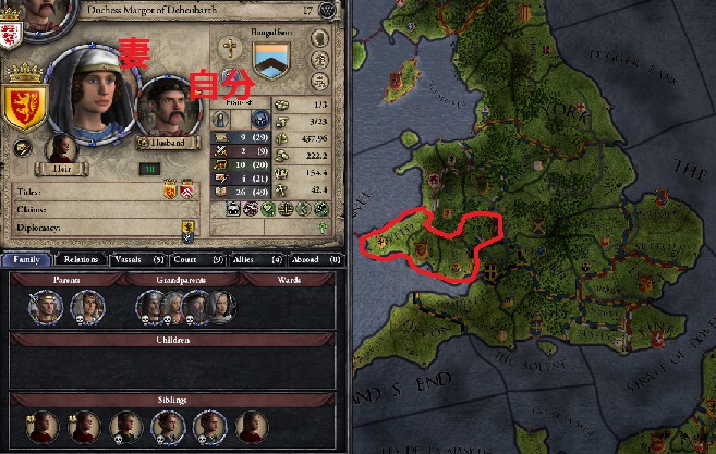 ①自分が男性の場合に女性当主と結婚し、跡継ぎを儲け両家を統合する方法です。(婿養子婚は駄目です、ただし自分が女性当主なら婿養子にしましょう。)上図が該当します。隣国の女公爵を妻としました。(遠すぎたり、他教に滅ぼされそうな相手は戦略上は考えものです。)同格なら妻となる可能性が十分あります。(伯爵の時は断られました。)ほとんどの相続法では男の子を儲ければ双方の後継者となります。(上の相続法リンク参照)