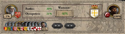 王位は十字軍への貢献度によって争われますが、仕様はやや複雑です。キリスト教徒の王位請求者が存在する場合は、そのうちの誰かが王位につきます。十字軍にもっとも貢献した勢力の関係者(同王朝、臣下など)がいれば、その人物が国王に就きます。キリスト教徒の王位請求者が居ない場合は貢献度の最も高かった勢力の領主が戴冠します。